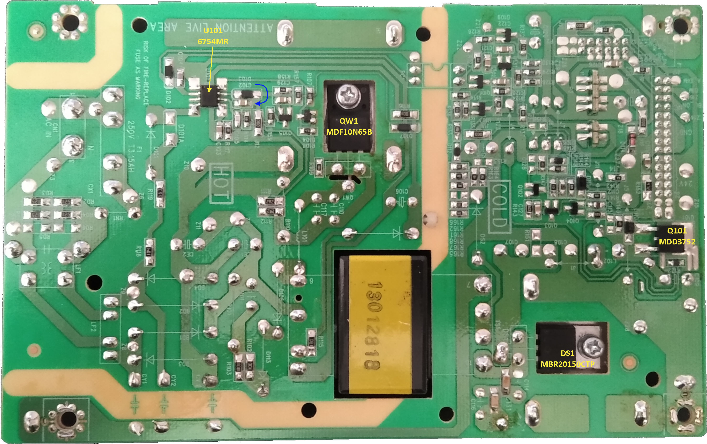 Eric a écrit :En premier lieu, fais-nous des belles photos R/V haute résolution de la carte d'alim, comme l'a fait le treblig dans ce post, en précisant les références lisibles sur les composants :